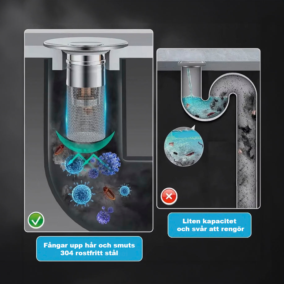 Den fångar upp allt som annars åker ner i röret: hår, smuts, tvålrester och småpartiklar som fastnar, bygger upp bakterier och till slut leder till dyra stopp.